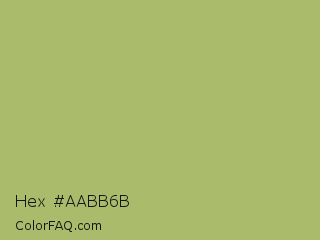 Hex #aabb6b Color is a normal lime color and the nearest color is Middle Green Yellow #acbf60. Hex code #aabb6b and RGB value is rgb(170,187,107). In RGB color space, this color is composed of 67% red, 73% green, 42% blue, In CMYK color space, this color is composed of 9% cyan, 0% magenta, 43% yellow , 27% black , In HSL color space, this color has a hue angle of 73° , 37% saturation and 58% lightness.