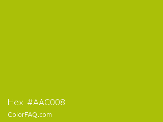 Hex #aac008 Color is a normal yellow color and the nearest color is Citrus #a1c50a. Hex code #aac008 and RGB value is rgb(170,192,8). In RGB color space, this color is composed of 67% red, 75% green, 3% blue, In CMYK color space, this color is composed of 11% cyan, 0% magenta, 96% yellow , 25% black , In HSL color space, this color has a hue angle of 67° , 92% saturation and 39% lightness.