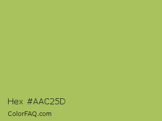 Hex #aac25d Color is a normal lime color and the nearest color is Middle Green Yellow #acbf60. Hex code #aac25d and RGB value is rgb(170,194,93). In RGB color space, this color is composed of 67% red, 76% green, 36% blue, In CMYK color space, this color is composed of 12% cyan, 0% magenta, 52% yellow , 24% black , In HSL color space, this color has a hue angle of 74° , 45% saturation and 56% lightness.