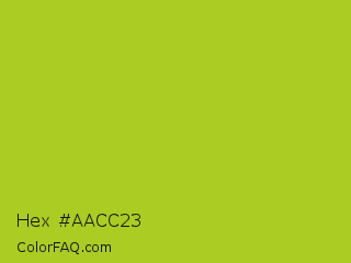Hex #aacc23 Color is a normal lime color and the nearest color is Acid Green #b0bf1a. Hex code #aacc23 and RGB value is rgb(170,204,35). In RGB color space, this color is composed of 67% red, 80% green, 14% blue, In CMYK color space, this color is composed of 17% cyan, 0% magenta, 83% yellow , 20% black , In HSL color space, this color has a hue angle of 72° , 71% saturation and 47% lightness.