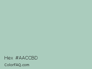 Hex #aaccbd Color is a light green color and the nearest color is Opal #a9c6c2. Hex code #aaccbd and RGB value is rgb(170,204,189). In RGB color space, this color is composed of 67% red, 80% green, 74% blue, In CMYK color space, this color is composed of 17% cyan, 0% magenta, 7% yellow , 20% black , In HSL color space, this color has a hue angle of 154° , 25% saturation and 73% lightness.