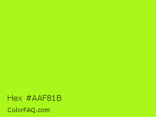 Hex #aaf81b Color is a normal green color and the nearest color is Green Yellow #adff2f. Hex code #aaf81b and RGB value is rgb(170,248,27). In RGB color space, this color is composed of 67% red, 97% green, 11% blue, In CMYK color space, this color is composed of 31% cyan, 0% magenta, 89% yellow , 3% black , In HSL color space, this color has a hue angle of 81° , 94% saturation and 54% lightness.