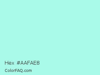 Hex #aafae8 Color is a very light cyan color and the nearest color is Ice Cold #b1f4e7. Hex code #aafae8 and RGB value is rgb(170,250,232). In RGB color space, this color is composed of 67% red, 98% green, 91% blue, In CMYK color space, this color is composed of 32% cyan, 0% magenta, 7% yellow , 2% black , In HSL color space, this color has a hue angle of 167° , 89% saturation and 82% lightness.