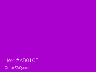 Hex #ab01ce Color is a normal purple color and the nearest color is Purple Munsell #9f00c5. Hex code #ab01ce and RGB value is rgb(171,1,206). In RGB color space, this color is composed of 67% red, 0% green, 81% blue, In CMYK color space, this color is composed of 17% cyan, 100% magenta, 0% yellow , 19% black , In HSL color space, this color has a hue angle of 290° , 99% saturation and 41% lightness.