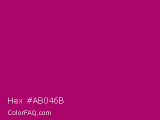 Hex #ab046b Color is a normal magenta color and the nearest color is Lipstick #ab0563. Hex code #ab046b and RGB value is rgb(171,4,107). In RGB color space, this color is composed of 67% red, 2% green, 42% blue, In CMYK color space, this color is composed of 0% cyan, 98% magenta, 37% yellow , 33% black , In HSL color space, this color has a hue angle of 323° , 95% saturation and 34% lightness.