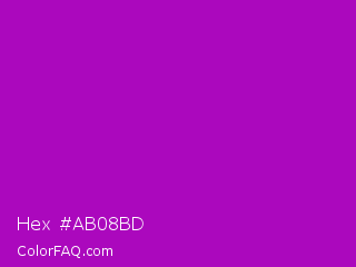 Hex #ab08bd Color is a normal magenta color and the nearest color is Heliotrope Magenta #aa00bb. Hex code #ab08bd and RGB value is rgb(171,8,189). In RGB color space, this color is composed of 67% red, 3% green, 74% blue, In CMYK color space, this color is composed of 10% cyan, 96% magenta, 0% yellow , 26% black , In HSL color space, this color has a hue angle of 294° , 92% saturation and 39% lightness.