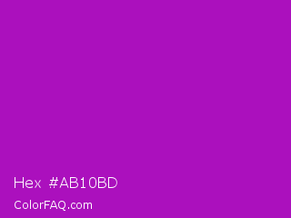 Hex #ab10bd Color is a normal magenta color and the nearest color is Heliotrope Magenta #aa00bb. Hex code #ab10bd and RGB value is rgb(171,16,189). In RGB color space, this color is composed of 67% red, 6% green, 74% blue, In CMYK color space, this color is composed of 10% cyan, 92% magenta, 0% yellow , 26% black , In HSL color space, this color has a hue angle of 294° , 84% saturation and 40% lightness.