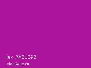 Hex #ab139b Color is a normal magenta color and the nearest color is Violet Eggplant #991199. Hex code #ab139b and RGB value is rgb(171,19,155). In RGB color space, this color is composed of 67% red, 7% green, 61% blue, In CMYK color space, this color is composed of 0% cyan, 89% magenta, 9% yellow , 33% black , In HSL color space, this color has a hue angle of 306° , 80% saturation and 37% lightness.
