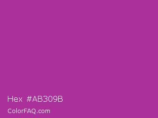 Hex #ab309b Color is a normal magenta color and the nearest color is Byzantine #bd33a4. Hex code #ab309b and RGB value is rgb(171,48,155). In RGB color space, this color is composed of 67% red, 19% green, 61% blue, In CMYK color space, this color is composed of 0% cyan, 72% magenta, 9% yellow , 33% black , In HSL color space, this color has a hue angle of 308° , 56% saturation and 43% lightness.