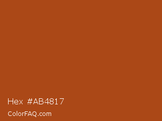 Hex #ab4817 Color is a normal orange color and the nearest color is Fiery Orange #b35213. Hex code #ab4817 and RGB value is rgb(171,72,23). In RGB color space, this color is composed of 67% red, 28% green, 9% blue, In CMYK color space, this color is composed of 0% cyan, 58% magenta, 87% yellow , 33% black , In HSL color space, this color has a hue angle of 20° , 76% saturation and 38% lightness.