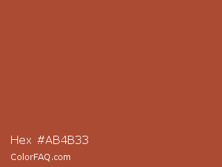 Hex #ab4b33 Color is a normal red color and the nearest color is Medium Carmine #af4035. Hex code #ab4b33 and RGB value is rgb(171,75,51). In RGB color space, this color is composed of 67% red, 29% green, 20% blue, In CMYK color space, this color is composed of 0% cyan, 56% magenta, 70% yellow , 33% black , In HSL color space, this color has a hue angle of 12° , 54% saturation and 44% lightness.