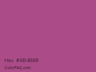 Hex #ab4b88 Color is a normal magenta color and the nearest color is Mystic Maroon #ad4379. Hex code #ab4b88 and RGB value is rgb(171,75,136). In RGB color space, this color is composed of 67% red, 29% green, 53% blue, In CMYK color space, this color is composed of 0% cyan, 56% magenta, 20% yellow , 33% black , In HSL color space, this color has a hue angle of 322° , 39% saturation and 48% lightness.