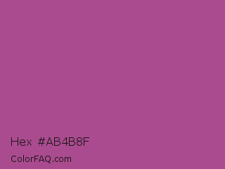 Hex #ab4b8f Color is a normal magenta color and the nearest color is Mystic Maroon #ad4379. Hex code #ab4b8f and RGB value is rgb(171,75,143). In RGB color space, this color is composed of 67% red, 29% green, 56% blue, In CMYK color space, this color is composed of 0% cyan, 56% magenta, 16% yellow , 33% black , In HSL color space, this color has a hue angle of 318° , 39% saturation and 48% lightness.