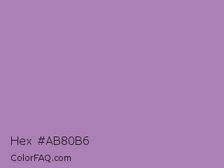 Hex #ab80b6 Color is a light purple color and the nearest color is African Violet #b284be. Hex code #ab80b6 and RGB value is rgb(171,128,182). In RGB color space, this color is composed of 67% red, 50% green, 71% blue, In CMYK color space, this color is composed of 6% cyan, 30% magenta, 0% yellow , 29% black , In HSL color space, this color has a hue angle of 288° , 27% saturation and 61% lightness.