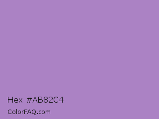Hex #ab82c4 Color is a light purple color and the nearest color is African Violet #b284be. Hex code #ab82c4 and RGB value is rgb(171,130,196). In RGB color space, this color is composed of 67% red, 51% green, 77% blue, In CMYK color space, this color is composed of 13% cyan, 34% magenta, 0% yellow , 23% black , In HSL color space, this color has a hue angle of 277° , 36% saturation and 64% lightness.