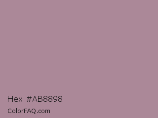 Hex #ab8898 Color is a normal rose color and the nearest color is Bouquet #ae809e. Hex code #ab8898 and RGB value is rgb(171,136,152). In RGB color space, this color is composed of 67% red, 53% green, 60% blue, In CMYK color space, this color is composed of 0% cyan, 20% magenta, 11% yellow , 33% black , In HSL color space, this color has a hue angle of 333° , 17% saturation and 60% lightness.