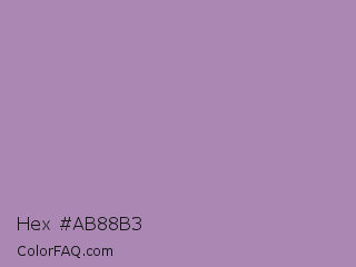 Hex #ab88b3 Color is a light purple color and the nearest color is Glossy Grape #ab92b3. Hex code #ab88b3 and RGB value is rgb(171,136,179). In RGB color space, this color is composed of 67% red, 53% green, 70% blue, In CMYK color space, this color is composed of 4% cyan, 24% magenta, 0% yellow , 30% black , In HSL color space, this color has a hue angle of 289° , 22% saturation and 62% lightness.