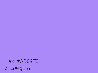 Hex #ab89f8 Color is a light indigo color and the nearest color is Dull Lavender #a899e6. Hex code #ab89f8 and RGB value is rgb(171,137,248). In RGB color space, this color is composed of 67% red, 54% green, 97% blue, In CMYK color space, this color is composed of 31% cyan, 45% magenta, 0% yellow , 3% black , In HSL color space, this color has a hue angle of 258° , 89% saturation and 75% lightness.