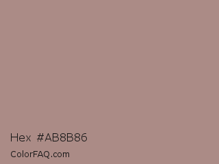 Hex #ab8b86 Color is a normal red color and the nearest color is Sandrift #ab917a. Hex code #ab8b86 and RGB value is rgb(171,139,134). In RGB color space, this color is composed of 67% red, 55% green, 53% blue, In CMYK color space, this color is composed of 0% cyan, 19% magenta, 22% yellow , 33% black , In HSL color space, this color has a hue angle of 8° , 18% saturation and 60% lightness.