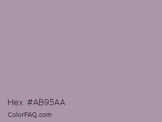 Hex #ab95aa Color is a light magenta color and the nearest color is Heliotrope Gray #aa98a9. Hex code #ab95aa and RGB value is rgb(171,149,170). In RGB color space, this color is composed of 67% red, 58% green, 67% blue, In CMYK color space, this color is composed of 0% cyan, 13% magenta, 1% yellow , 33% black , In HSL color space, this color has a hue angle of 303° , 12% saturation and 63% lightness.