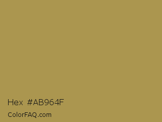 Hex #ab964f Color is a normal yellow color and the nearest color is Limed Oak #ac8a56. Hex code #ab964f and RGB value is rgb(171,150,79). In RGB color space, this color is composed of 67% red, 59% green, 31% blue, In CMYK color space, this color is composed of 0% cyan, 12% magenta, 54% yellow , 33% black , In HSL color space, this color has a hue angle of 46° , 37% saturation and 49% lightness.