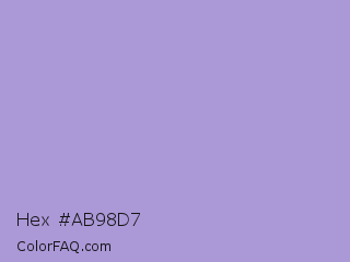 Hex #ab98d7 Color is a light indigo color and the nearest color is Light Pastel Purple #b19cd9. Hex code #ab98d7 and RGB value is rgb(171,152,215). In RGB color space, this color is composed of 67% red, 60% green, 84% blue, In CMYK color space, this color is composed of 20% cyan, 29% magenta, 0% yellow , 16% black , In HSL color space, this color has a hue angle of 258° , 44% saturation and 72% lightness.