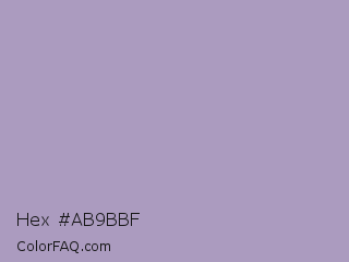 Hex #ab9bbf Color is a light violet color and the nearest color is Pastel Purple #b39eb5. Hex code #ab9bbf and RGB value is rgb(171,155,191). In RGB color space, this color is composed of 67% red, 61% green, 75% blue, In CMYK color space, this color is composed of 10% cyan, 19% magenta, 0% yellow , 25% black , In HSL color space, this color has a hue angle of 267° , 22% saturation and 68% lightness.