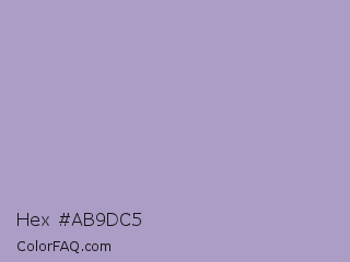 Hex #ab9dc5 Color is a light violet color and the nearest color is Logan #aaa9cd. Hex code #ab9dc5 and RGB value is rgb(171,157,197). In RGB color space, this color is composed of 67% red, 62% green, 77% blue, In CMYK color space, this color is composed of 13% cyan, 20% magenta, 0% yellow , 23% black , In HSL color space, this color has a hue angle of 261° , 26% saturation and 69% lightness.