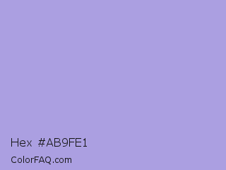 Hex #ab9fe1 Color is a light indigo color and the nearest color is Cold Purple #aba0d9. Hex code #ab9fe1 and RGB value is rgb(171,159,225). In RGB color space, this color is composed of 67% red, 62% green, 88% blue, In CMYK color space, this color is composed of 24% cyan, 29% magenta, 0% yellow , 12% black , In HSL color space, this color has a hue angle of 251° , 52% saturation and 75% lightness.