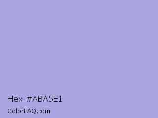 Hex #aba5e1 Color is a light indigo color and the nearest color is Maximum Blue Purple #acace6. Hex code #aba5e1 and RGB value is rgb(171,165,225). In RGB color space, this color is composed of 67% red, 65% green, 88% blue, In CMYK color space, this color is composed of 24% cyan, 27% magenta, 0% yellow , 12% black , In HSL color space, this color has a hue angle of 246° , 50% saturation and 76% lightness.