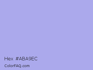 Hex #aba9ec Color is a light indigo color and the nearest color is Maximum Blue Purple #acace6. Hex code #aba9ec and RGB value is rgb(171,169,236). In RGB color space, this color is composed of 67% red, 66% green, 93% blue, In CMYK color space, this color is composed of 28% cyan, 28% magenta, 0% yellow , 7% black , In HSL color space, this color has a hue angle of 242° , 64% saturation and 79% lightness.