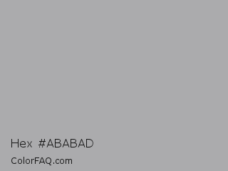 Hex #ababad Color is a light blue color and the nearest color is Silver Chalice #acacac. Hex code #ababad and RGB value is rgb(171,171,173). In RGB color space, this color is composed of 67% red, 67% green, 68% blue, In CMYK color space, this color is composed of 1% cyan, 1% magenta, 0% yellow , 32% black , In HSL color space, this color has a hue angle of 240° , 1% saturation and 67% lightness.