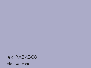 Hex #ababc8 Color is a light blue color and the nearest color is Logan #aaa9cd. Hex code #ababc8 and RGB value is rgb(171,171,200). In RGB color space, this color is composed of 67% red, 67% green, 78% blue, In CMYK color space, this color is composed of 15% cyan, 15% magenta, 0% yellow , 22% black , In HSL color space, this color has a hue angle of 240° , 21% saturation and 73% lightness.