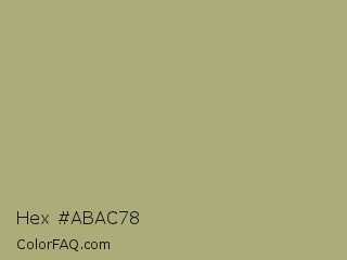 Hex #abac78 Color is a normal yellow color and the nearest color is Green Smoke #a4af6e. Hex code #abac78 and RGB value is rgb(171,172,120). In RGB color space, this color is composed of 67% red, 67% green, 47% blue, In CMYK color space, this color is composed of 1% cyan, 0% magenta, 30% yellow , 33% black , In HSL color space, this color has a hue angle of 61° , 24% saturation and 57% lightness.