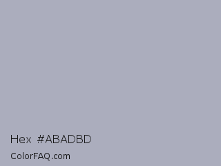 Hex #abadbd Color is a light blue color and the nearest color is Spun Pearl #aaabb7. Hex code #abadbd and RGB value is rgb(171,173,189). In RGB color space, this color is composed of 67% red, 68% green, 74% blue, In CMYK color space, this color is composed of 10% cyan, 8% magenta, 0% yellow , 26% black , In HSL color space, this color has a hue angle of 233° , 12% saturation and 71% lightness.