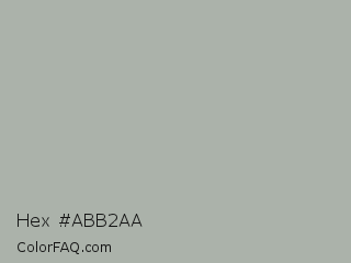 Hex #abb2aa Color is a light green color and the nearest color is Silver Chalice #acacac. Hex code #abb2aa and RGB value is rgb(171,178,170). In RGB color space, this color is composed of 67% red, 70% green, 67% blue, In CMYK color space, this color is composed of 4% cyan, 0% magenta, 4% yellow , 30% black , In HSL color space, this color has a hue angle of 113° , 5% saturation and 68% lightness.