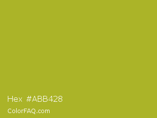 Hex #abb428 Color is a normal yellow color and the nearest color is Acid Green #b0bf1a. Hex code #abb428 and RGB value is rgb(171,180,40). In RGB color space, this color is composed of 67% red, 71% green, 16% blue, In CMYK color space, this color is composed of 5% cyan, 0% magenta, 78% yellow , 29% black , In HSL color space, this color has a hue angle of 64° , 64% saturation and 43% lightness.