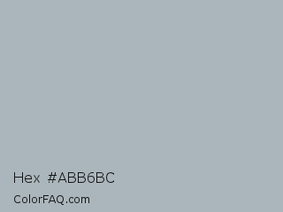 Hex #abb6bc Color is a light blue color and the nearest color is Bombay #afb1b8. Hex code #abb6bc and RGB value is rgb(171,182,188). In RGB color space, this color is composed of 67% red, 71% green, 74% blue, In CMYK color space, this color is composed of 9% cyan, 3% magenta, 0% yellow , 26% black , In HSL color space, this color has a hue angle of 201° , 11% saturation and 70% lightness.