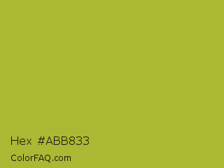Hex #abb833 Color is a normal yellow color and the nearest color is Android Green #a4c639. Hex code #abb833 and RGB value is rgb(171,184,51). In RGB color space, this color is composed of 67% red, 72% green, 20% blue, In CMYK color space, this color is composed of 7% cyan, 0% magenta, 72% yellow , 28% black , In HSL color space, this color has a hue angle of 66° , 57% saturation and 46% lightness.