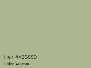 Hex #abb88d Color is a light lime color and the nearest color is Swamp Green #acb78e. Hex code #abb88d and RGB value is rgb(171,184,141). In RGB color space, this color is composed of 67% red, 72% green, 55% blue, In CMYK color space, this color is composed of 7% cyan, 0% magenta, 23% yellow , 28% black , In HSL color space, this color has a hue angle of 78° , 23% saturation and 64% lightness.