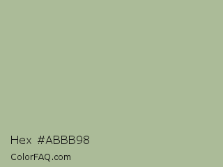 Hex #abbb98 Color is a light green color and the nearest color is Laurel Green #a9ba9d. Hex code #abbb98 and RGB value is rgb(171,187,152). In RGB color space, this color is composed of 67% red, 73% green, 60% blue, In CMYK color space, this color is composed of 9% cyan, 0% magenta, 19% yellow , 27% black , In HSL color space, this color has a hue angle of 87° , 20% saturation and 66% lightness.