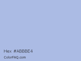 Hex #abbbe4 Color is a light blue color and the nearest color is Pigeon Post #afbdd9. Hex code #abbbe4 and RGB value is rgb(171,187,228). In RGB color space, this color is composed of 67% red, 73% green, 89% blue, In CMYK color space, this color is composed of 25% cyan, 18% magenta, 0% yellow , 11% black , In HSL color space, this color has a hue angle of 223° , 51% saturation and 78% lightness.