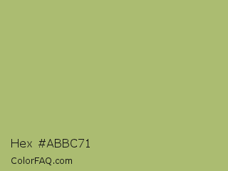 Hex #abbc71 Color is a normal lime color and the nearest color is Green Smoke #a4af6e. Hex code #abbc71 and RGB value is rgb(171,188,113). In RGB color space, this color is composed of 67% red, 74% green, 44% blue, In CMYK color space, this color is composed of 9% cyan, 0% magenta, 40% yellow , 26% black , In HSL color space, this color has a hue angle of 74° , 36% saturation and 59% lightness.