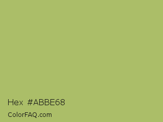 Hex #abbe68 Color is a normal lime color and the nearest color is Middle Green Yellow #acbf60. Hex code #abbe68 and RGB value is rgb(171,190,104). In RGB color space, this color is composed of 67% red, 75% green, 41% blue, In CMYK color space, this color is composed of 10% cyan, 0% magenta, 45% yellow , 25% black , In HSL color space, this color has a hue angle of 73° , 40% saturation and 58% lightness.