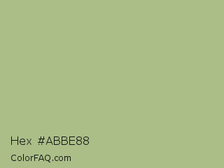 Hex #abbe88 Color is a light green color and the nearest color is Swamp Green #acb78e. Hex code #abbe88 and RGB value is rgb(171,190,136). In RGB color space, this color is composed of 67% red, 75% green, 53% blue, In CMYK color space, this color is composed of 10% cyan, 0% magenta, 28% yellow , 25% black , In HSL color space, this color has a hue angle of 81° , 29% saturation and 64% lightness.