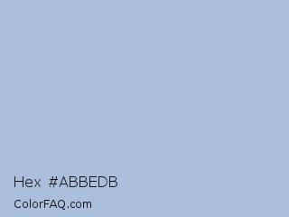 Hex #abbedb Color is a light blue color and the nearest color is Pigeon Post #afbdd9. Hex code #abbedb and RGB value is rgb(171,190,219). In RGB color space, this color is composed of 67% red, 75% green, 86% blue, In CMYK color space, this color is composed of 22% cyan, 13% magenta, 0% yellow , 14% black , In HSL color space, this color has a hue angle of 216° , 40% saturation and 76% lightness.