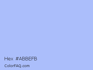 Hex #abbefb Color is a very light blue color and the nearest color is Perano #a9bef2. Hex code #abbefb and RGB value is rgb(171,190,251). In RGB color space, this color is composed of 67% red, 75% green, 98% blue, In CMYK color space, this color is composed of 32% cyan, 24% magenta, 0% yellow , 2% black , In HSL color space, this color has a hue angle of 226° , 91% saturation and 83% lightness.