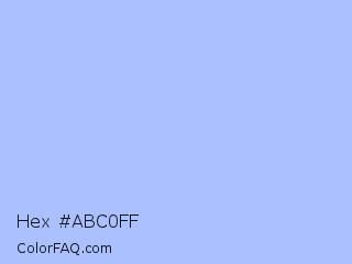 Hex #abc0ff Color is a very light blue color and the nearest color is Perano #a9bef2. Hex code #abc0ff and RGB value is rgb(171,192,255). In RGB color space, this color is composed of 67% red, 75% green, 100% blue, In CMYK color space, this color is composed of 33% cyan, 25% magenta, 0% yellow , 0% black , In HSL color space, this color has a hue angle of 225° , 100% saturation and 84% lightness.