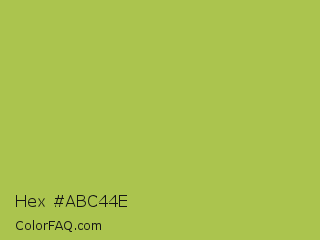 Hex #abc44e Color is a normal lime color and the nearest color is Middle Green Yellow #acbf60. Hex code #abc44e and RGB value is rgb(171,196,78). In RGB color space, this color is composed of 67% red, 77% green, 31% blue, In CMYK color space, this color is composed of 13% cyan, 0% magenta, 60% yellow , 23% black , In HSL color space, this color has a hue angle of 73° , 50% saturation and 54% lightness.