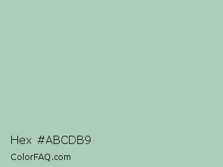 Hex #abcdb9 Color is a light green color and the nearest color is Spring Rain #accbb1. Hex code #abcdb9 and RGB value is rgb(171,205,185). In RGB color space, this color is composed of 67% red, 80% green, 73% blue, In CMYK color space, this color is composed of 17% cyan, 0% magenta, 10% yellow , 20% black , In HSL color space, this color has a hue angle of 145° , 25% saturation and 74% lightness.